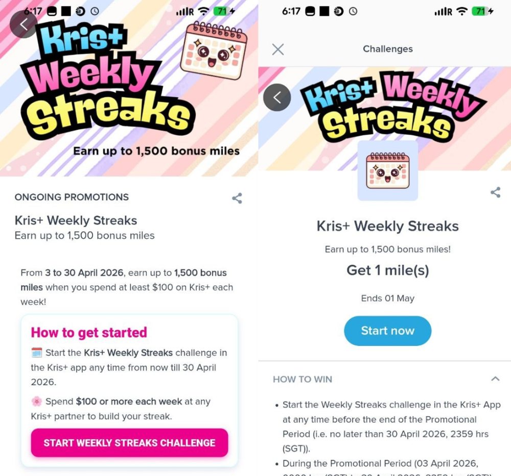 Kris+ has launched a new Weekly Streaks Challenge, which awards up to 1,500 bonus miles to users who spend at least S$100 every week for the month of April 2026, at any Kris+ partner.