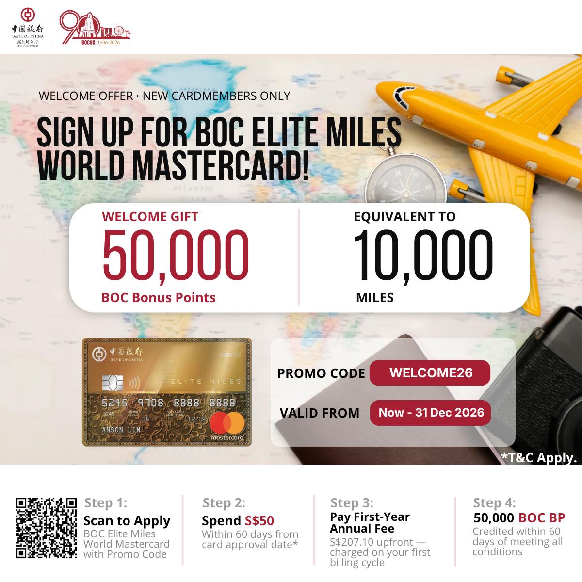 But what I’m about to share with you today simply blows them all away. I hope you’re sitting down, because for the rest of 2026, the BOC Elite Miles Card is offering a whopping 10,000 miles sign-up bonus with a minimum spend of just S$50, and payment of the first year’s S$207.10 annual fee.
