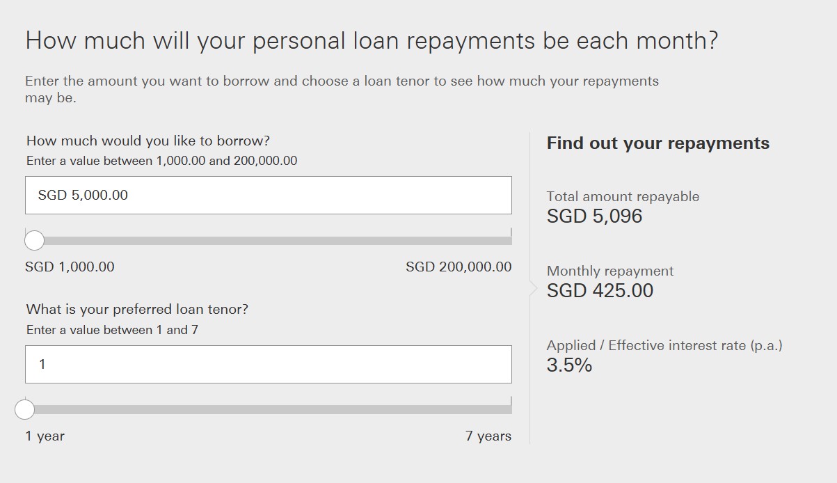 Based on the quoted EIR of 3.5% p.a., you’ll repay a total of S$425 per month, or S$5,096 over the life of the loan. Mind you, the 3.5% p.a. EIR is for HSBC Premier customers only. A higher rate may apply to regular HSBC customers.