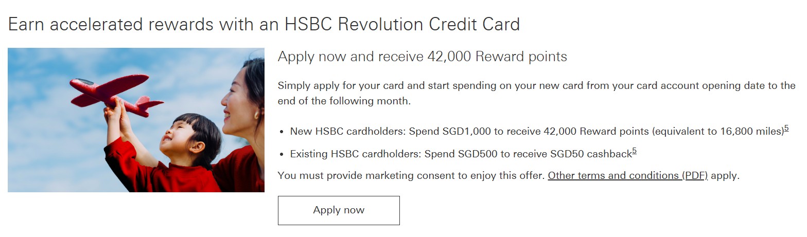 From 1 April to 30 June 2026, customers who apply for a HSBC Revolution Card will receive either 16,800 bonus miles, or S$50 cashback.