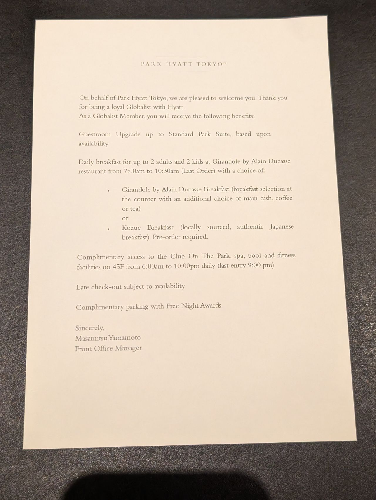 I booked a three-night stay at the Park Hyatt Tokyo, redeeming 45,000 points per night and using a Guest of Honour (GoH) certificate.