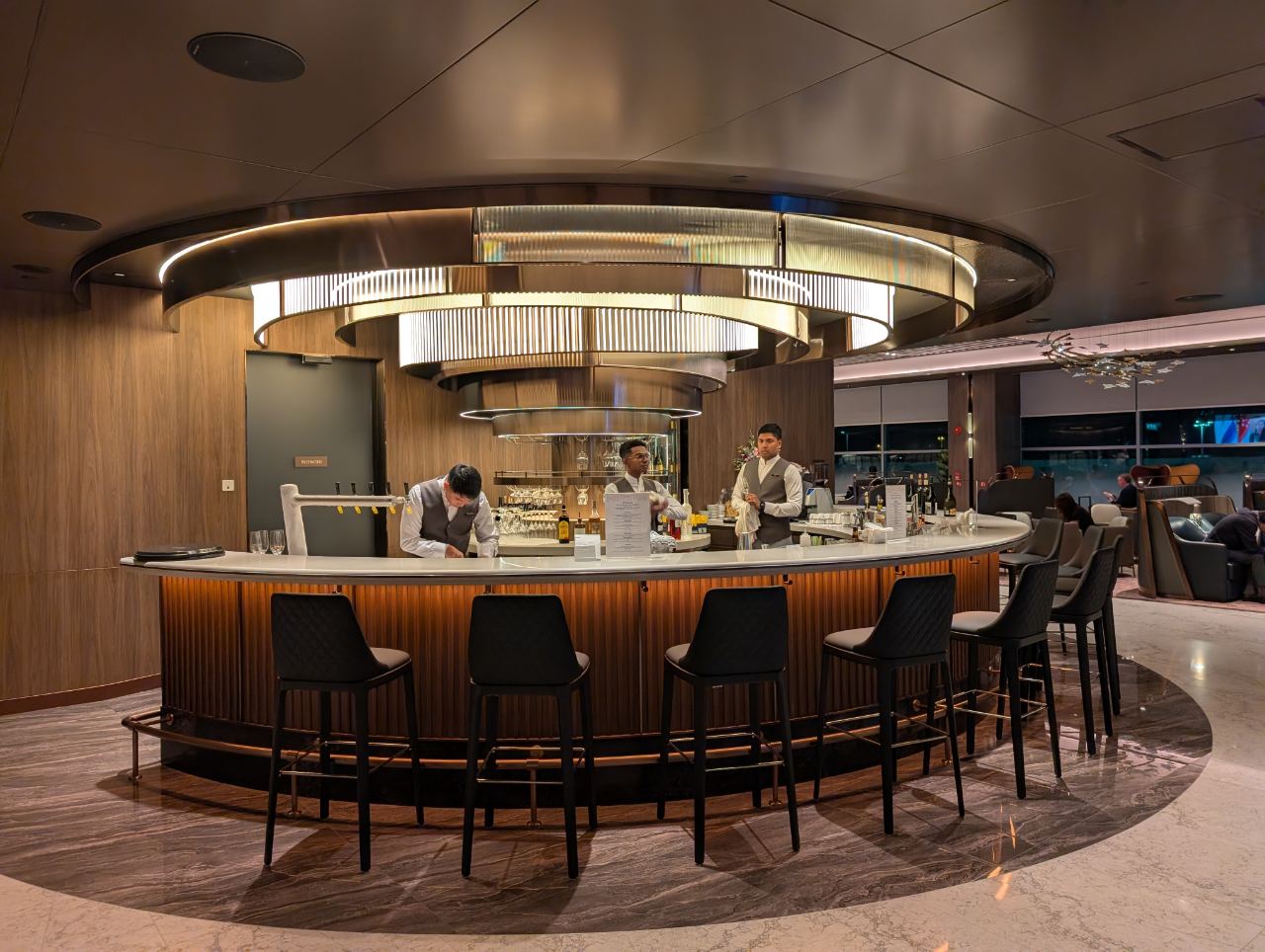 Over in Terminal 2, the SilverKris First Class Lounge offers the Signature Bar, which seats 12. It’s not nearly as bling as its Terminal 3 counterpart, but plays it more sleekly sophisticated with a concentric ceiling that plays with light and shadow, layered with cove lights and linear accents.